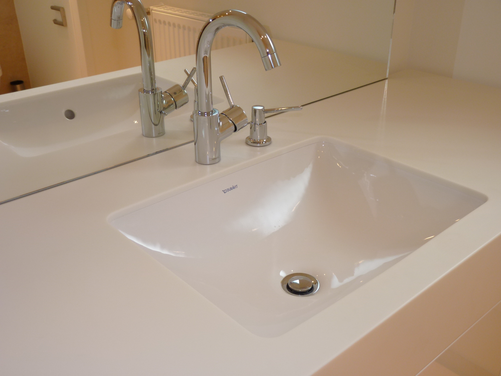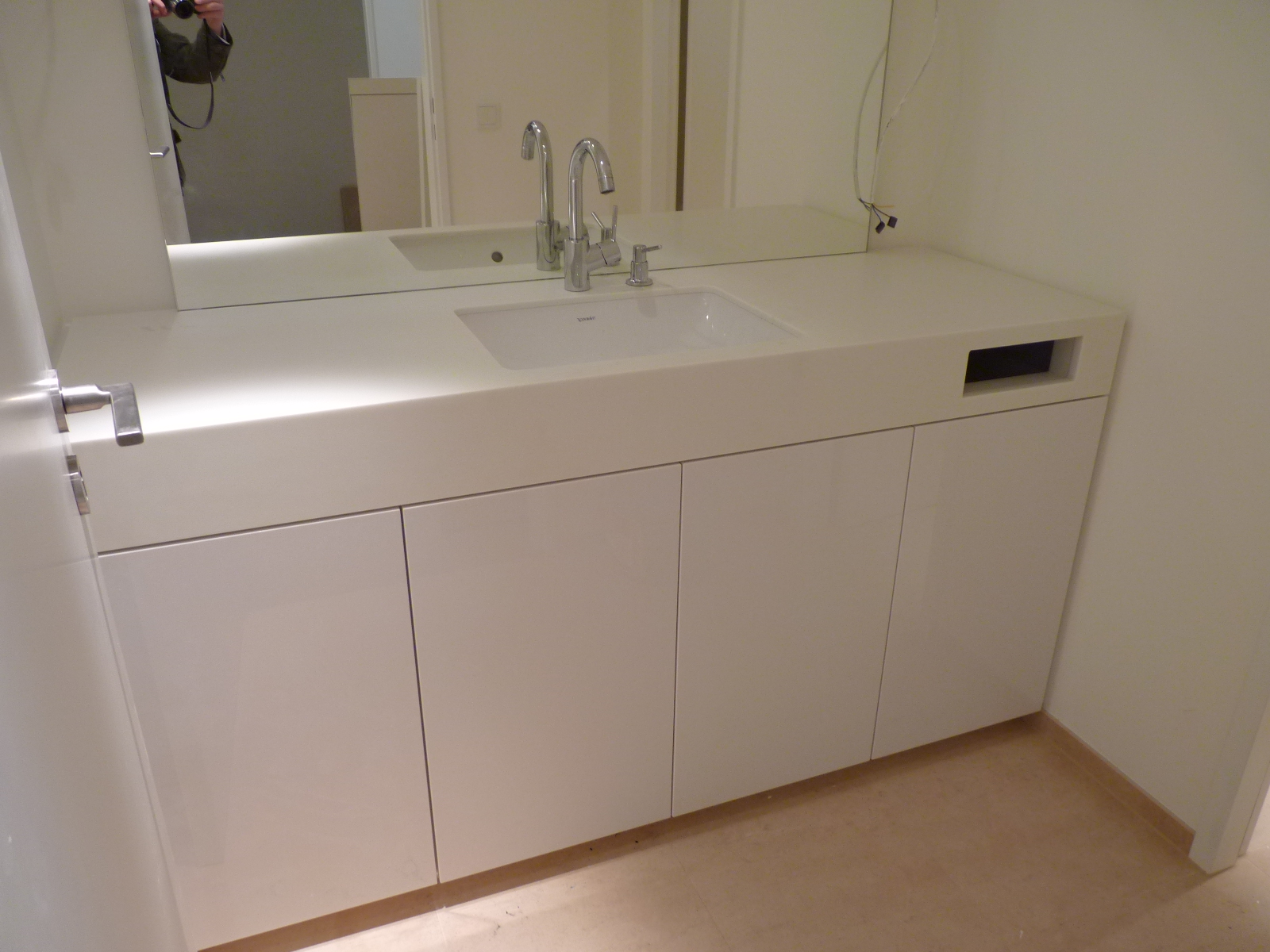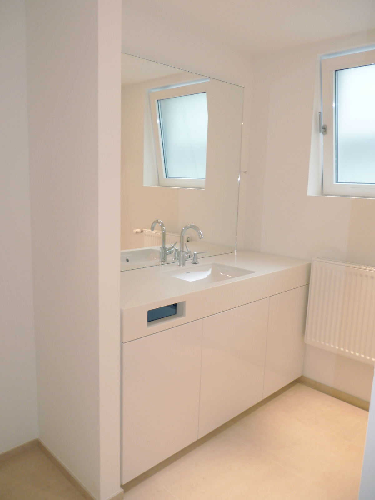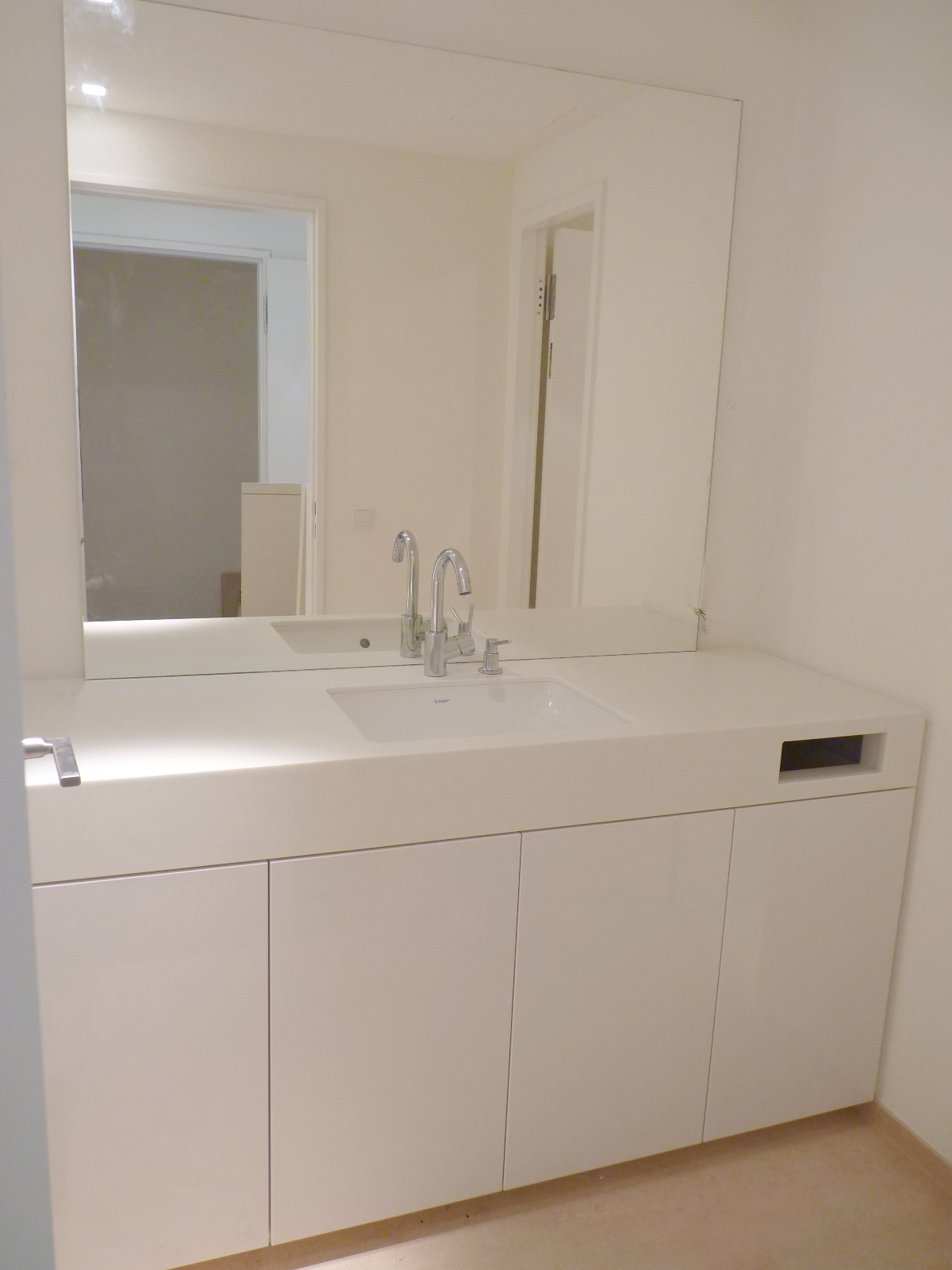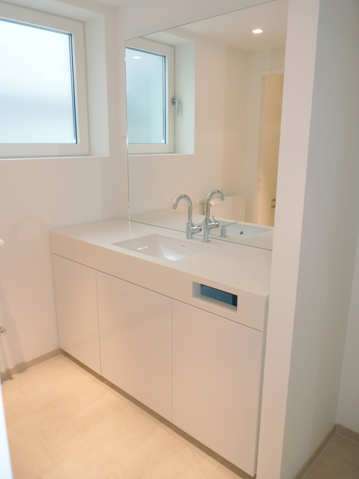 Waschnische, Schrankfronten aus Parapan®, Platte Mineralwerkstoff LG HI-MACS® in passender Farbgebung, Edelstahlsockel, großflächiger Spiegel