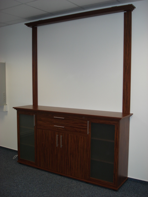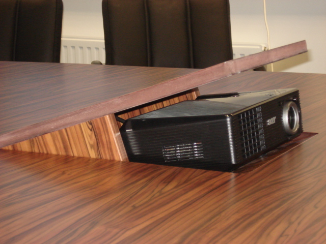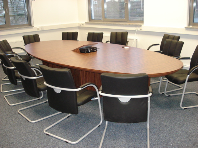 Zu sehen ist hier ein Tisch aus robuster kunststoffbeschichteter Dekorplatte. In die Tischplatte wurde ein versenkbarer Beamer integriert. Die Stühle sind mit Leder bezogen und bieten dadurch, dass sie freischwingend sind, auch bei längeren Meetings ausreichend Sitzkomfort. Am oberen Ende befindet sich eine Schrankkonstruktion mit einer ausfahrbaren Leinwand.