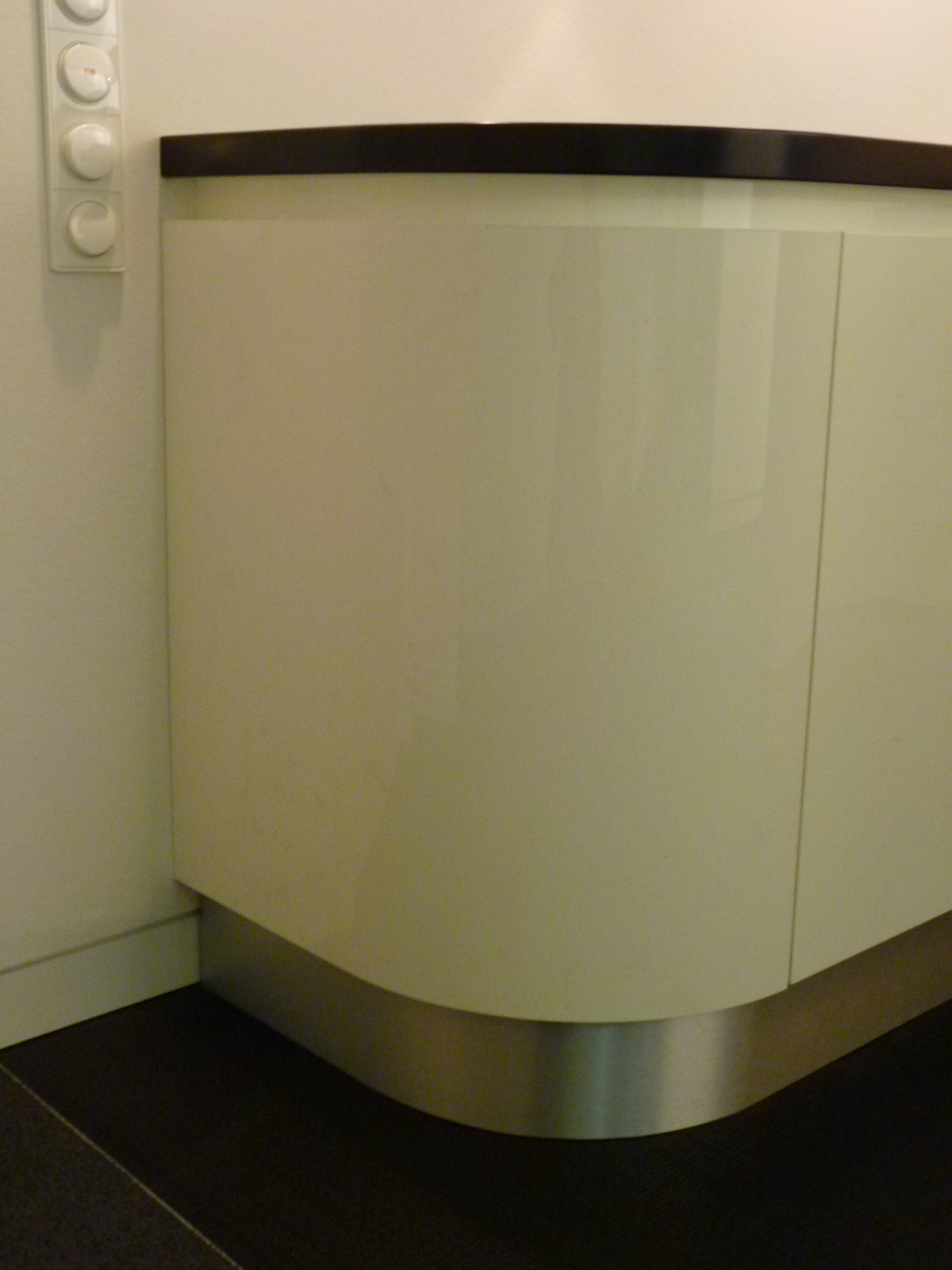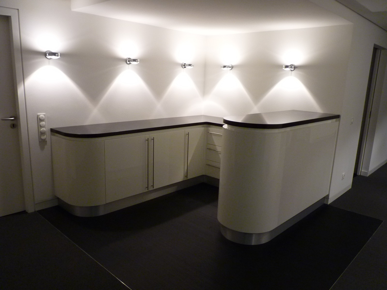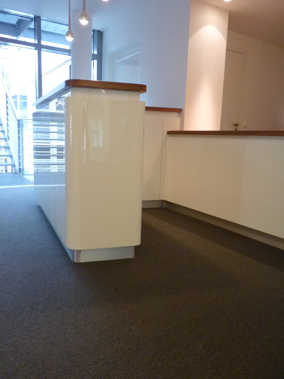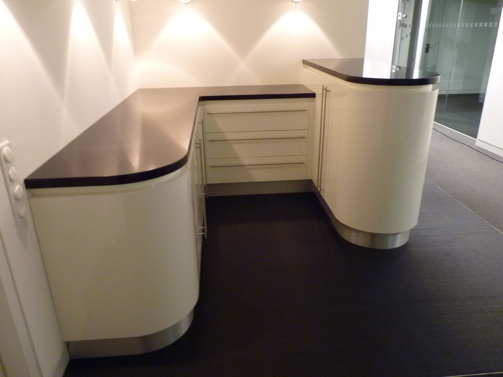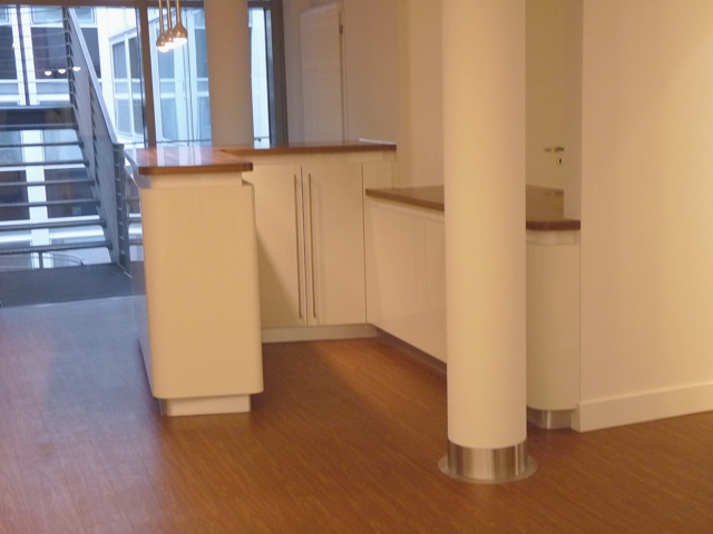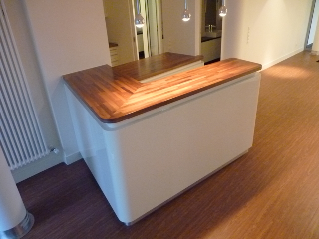 Bartresen in einem exklusiven Bürokomplex aus kichtdurchscheinendem (luzent) Mineralwerkstoff mit Massivholzaufsatz und Edelstahlsockel.