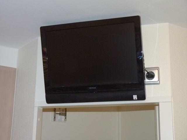 Mack-Wohnwagen: Funktionelle Küche mit verschiedenen praktischen Einbaugeräten und als Besonderheit einem extra Fernseher über der Tür.